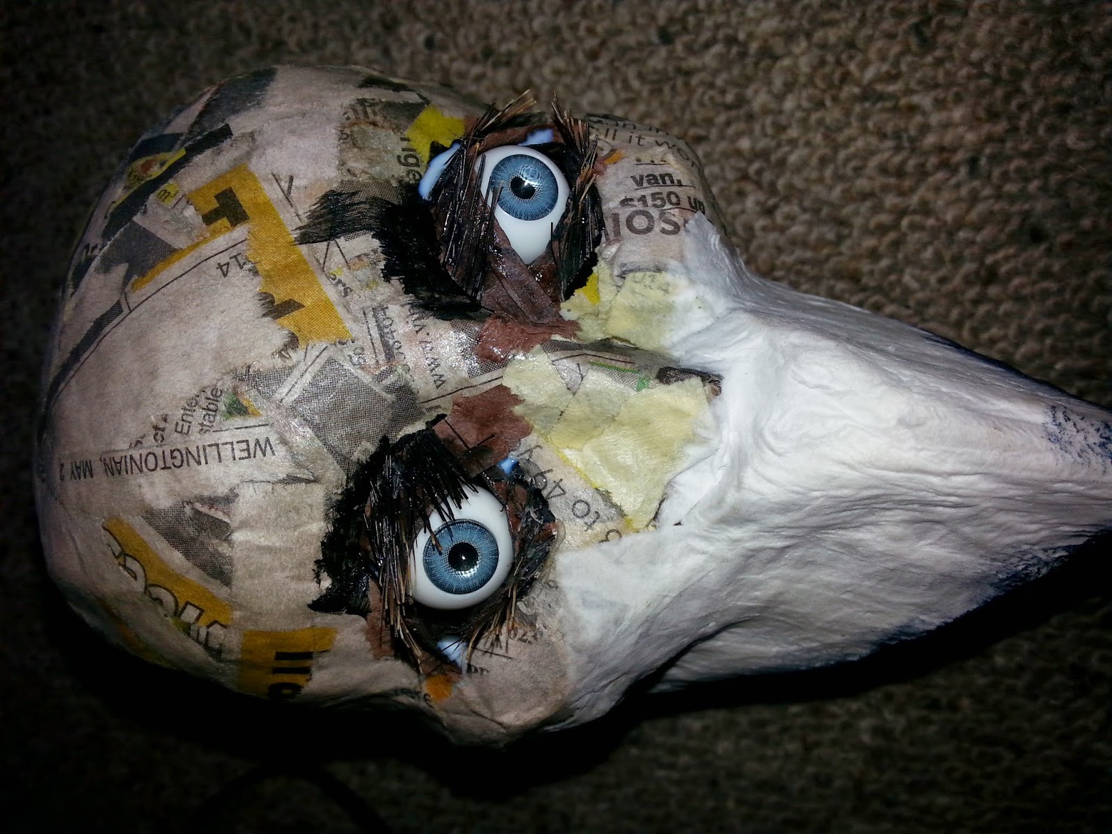 These are doll eyes. I got a bag of them online a while back, thinking they would be perfect for the harpy. I stuck them in the appropriate place and got started on the eyelids. These are fun to do. Look carefully, and you will see the lids come complete with eyelashes. In this case the eyelashes are made from hairbrush bristles, but any kind of appropriate bristle will get the job done. I don't recommend using false eyelashes though. Whatever you do with them, they look like - well, like false eyelashes.